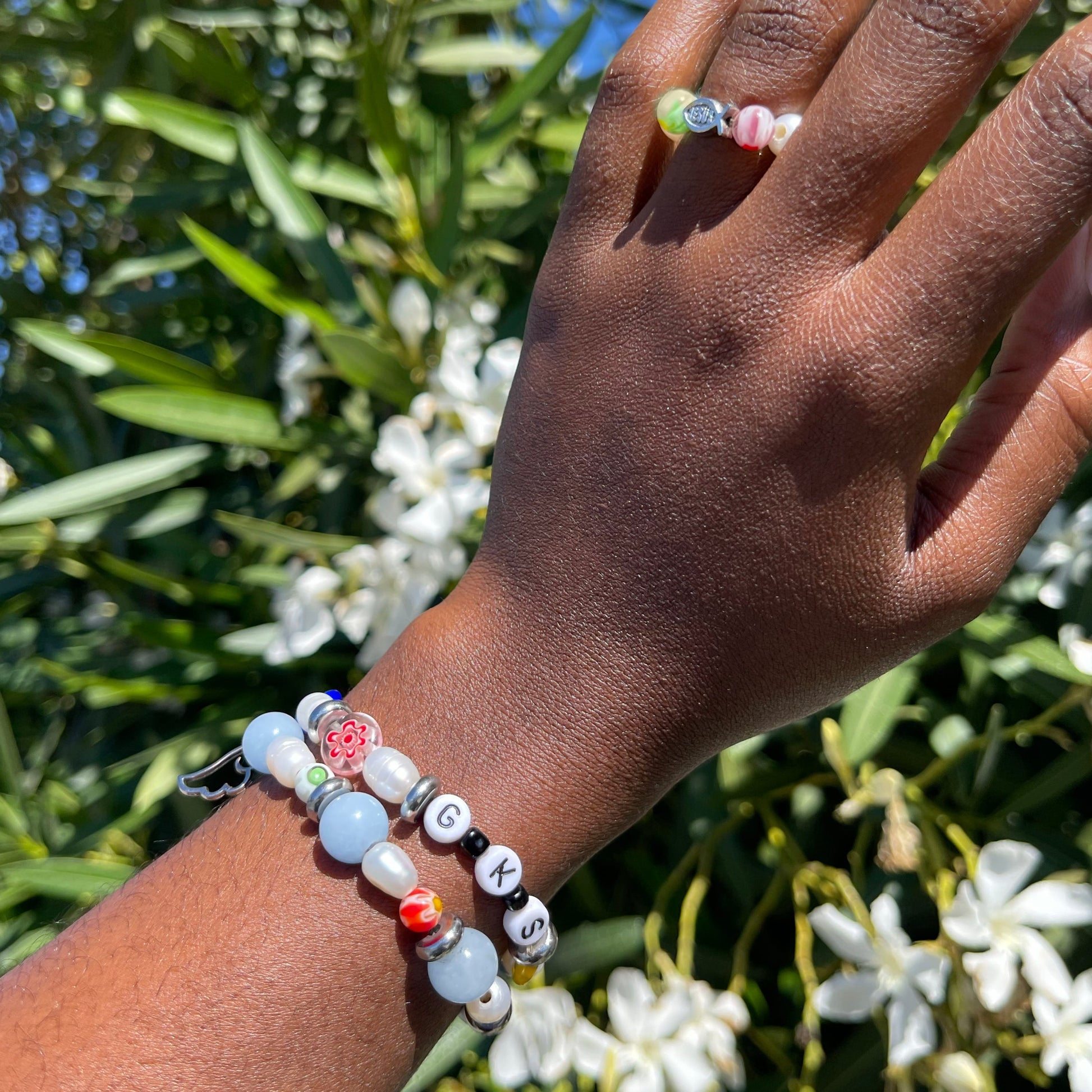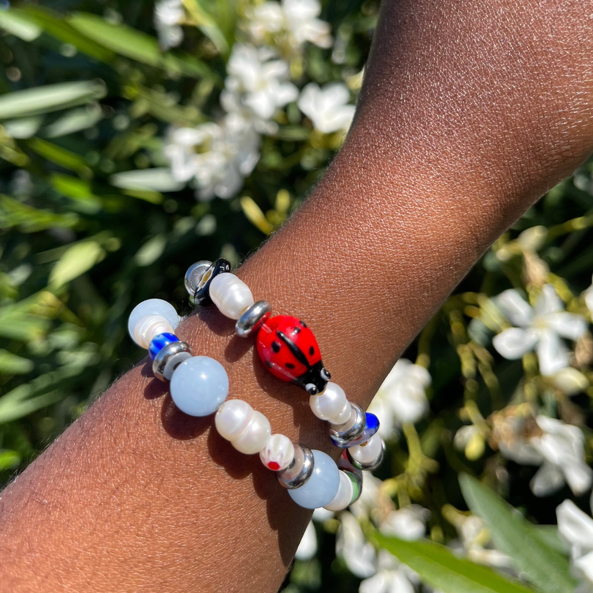 Our "favor" bracelet is a one-of-a-kind statement piece made entirely of freshwater pearls, millefiori lampwork glass beads, either gold brass or silver steel spacer beads, and a ladybug lampwork glass bead. This bracelet is stretchy and does not have clasps. To your preference, the bracelet can feature initials, numbers, or a word.
