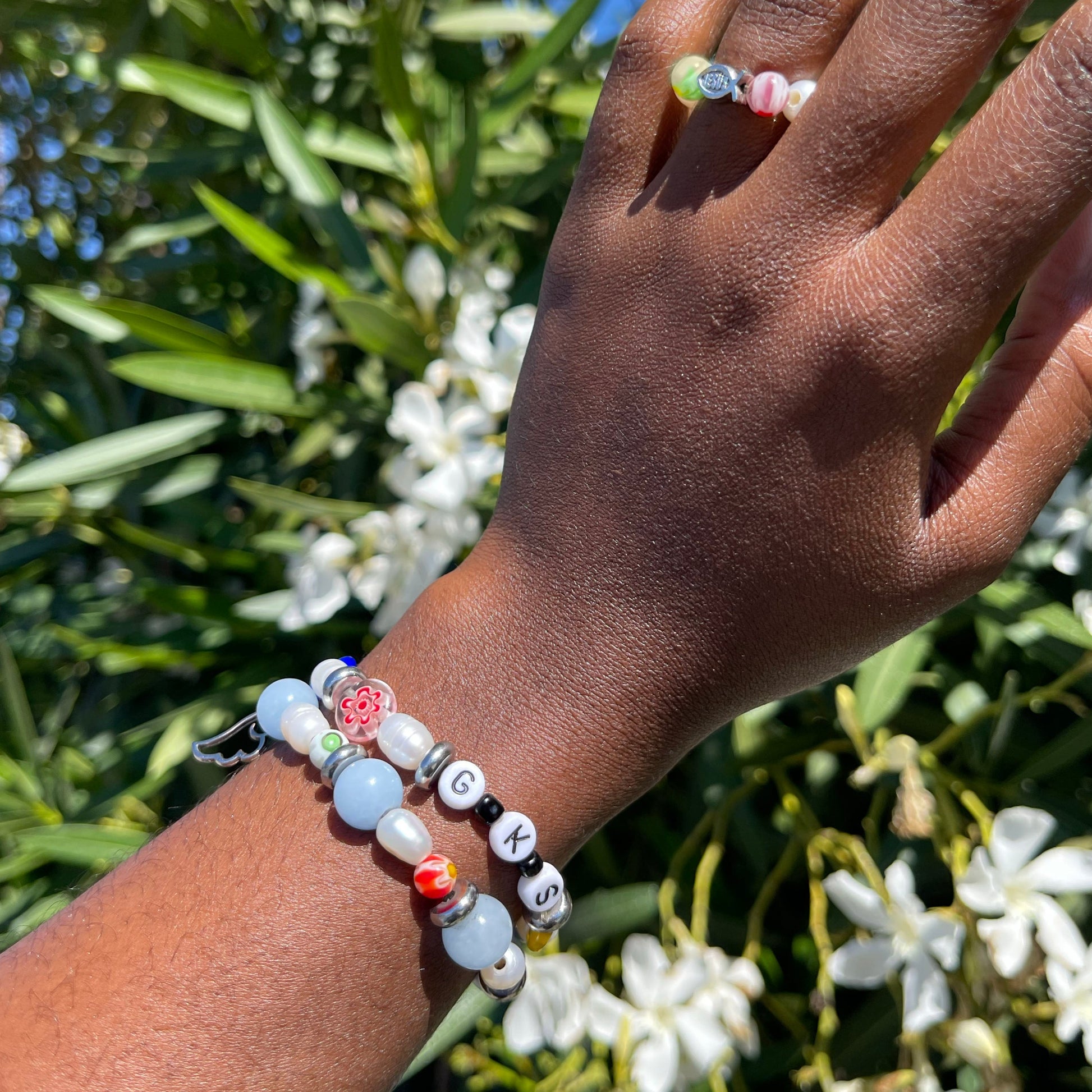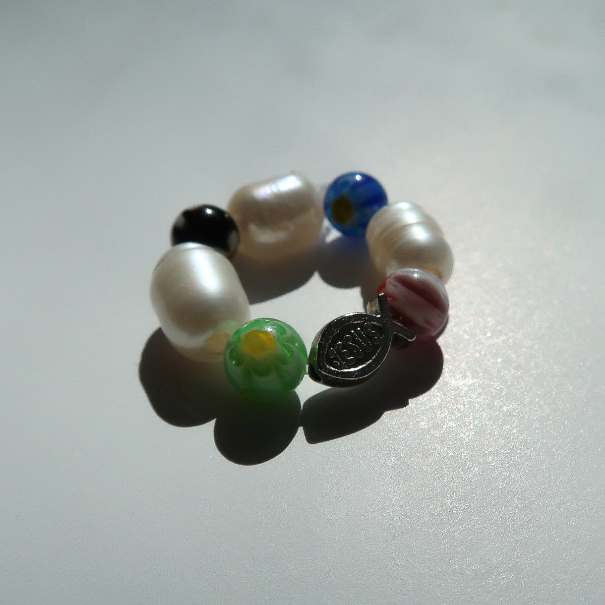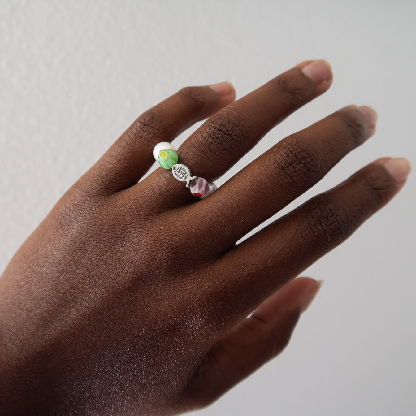 Say hello to our first ring! The "Jesus Loves You" ring is a one-of-a-kind statement piece made entirely of freshwater pearls, millefiori lampwork glass beads, and a special silver, Ichthys "Jesus Fish" accent bead. This accent bead is crafted with zinc alloy that is both lead and nickel-free.