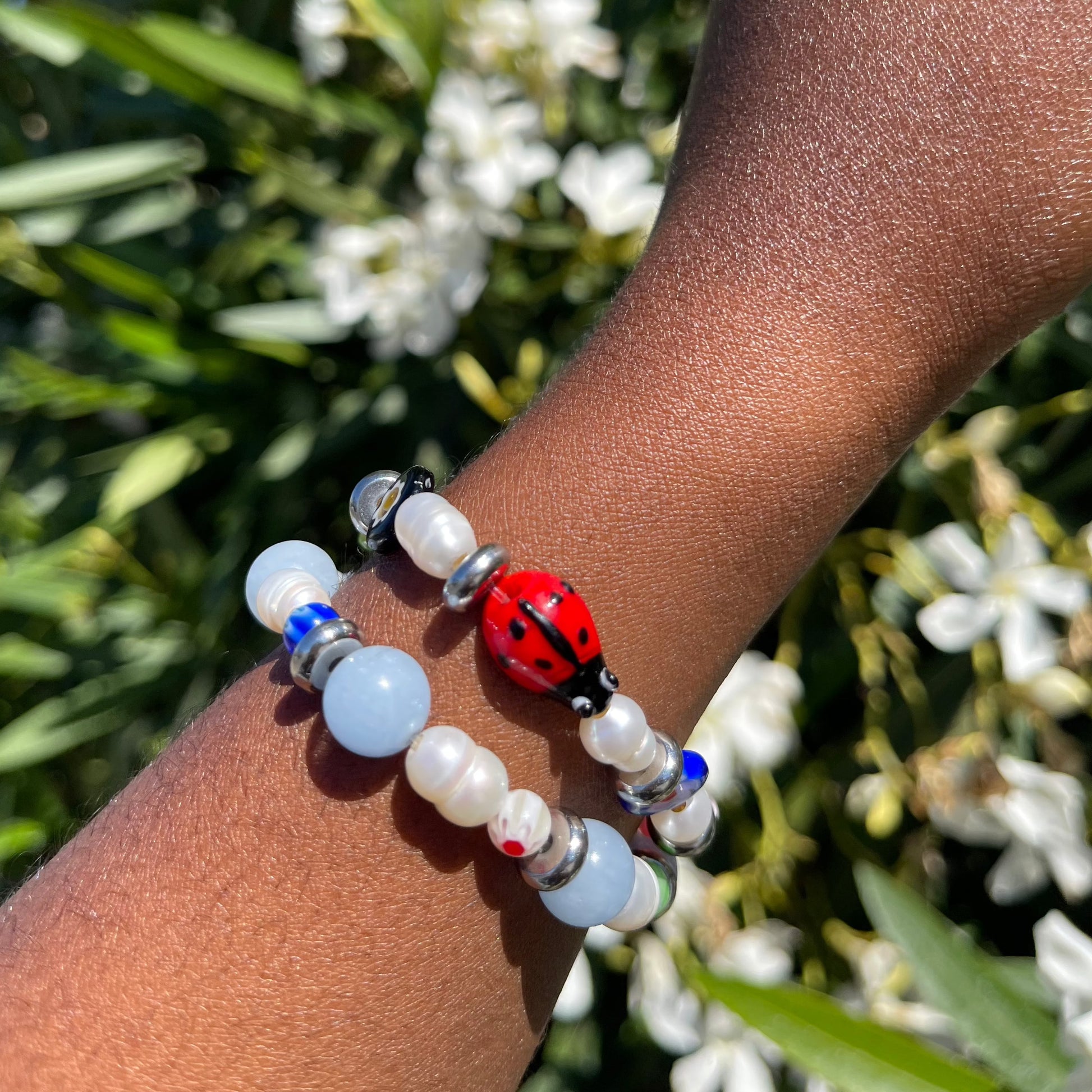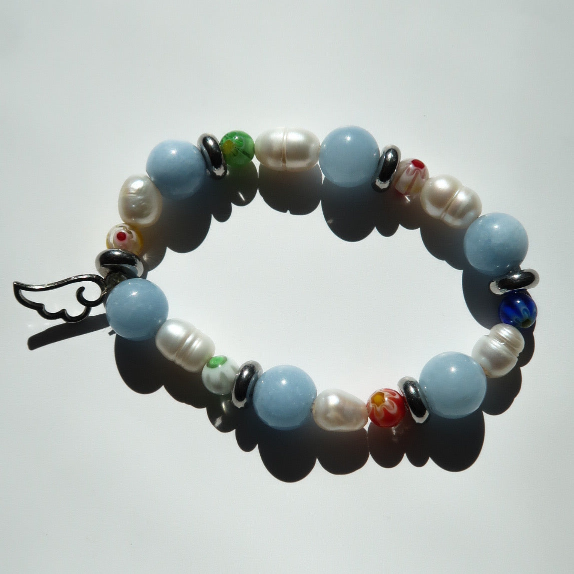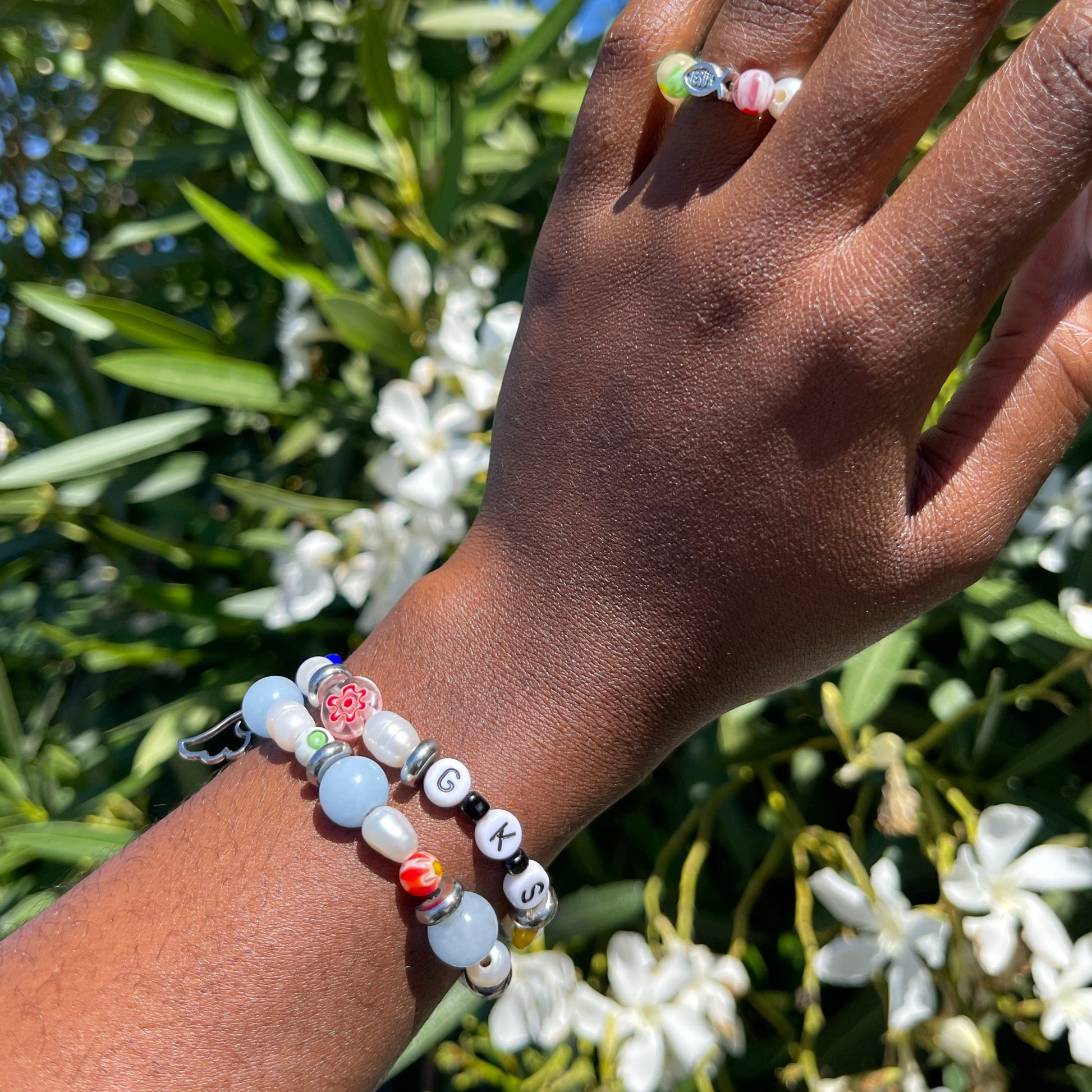 Our "water" bracelet is a one-of-a-kind statement piece made entirely of freshwater pearls, millefiori lampwork glass beads, either gold brass or silver steel spacer beads, and aquamarine gemstone beads sourced from Puerto Rico. This bracelet is stretchy and does not have clasps. To your preference, the bracelet can feature initials , numbers, or a word.